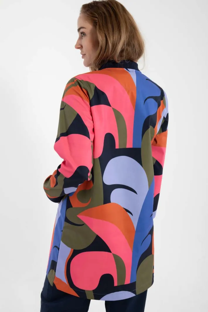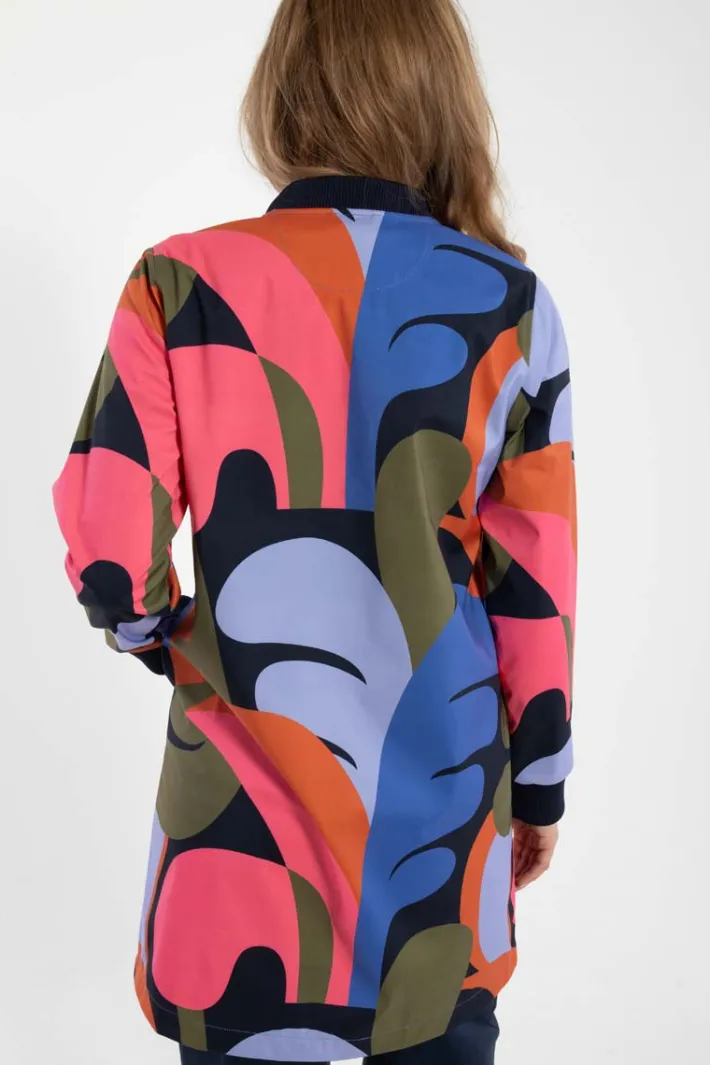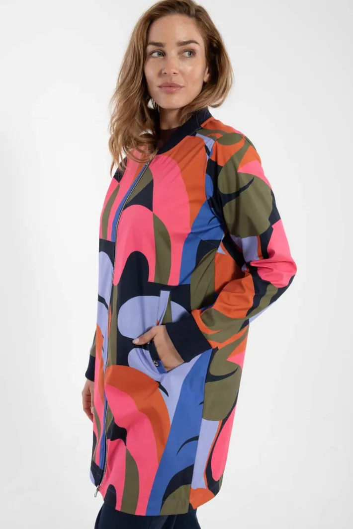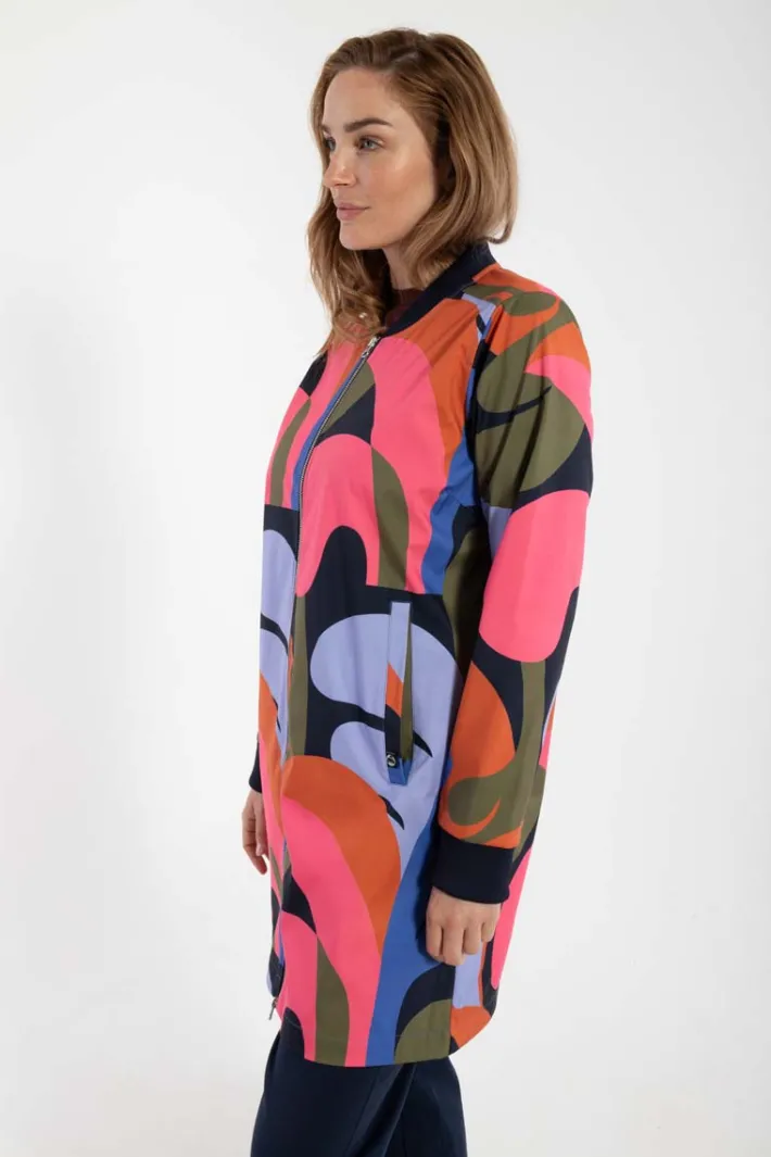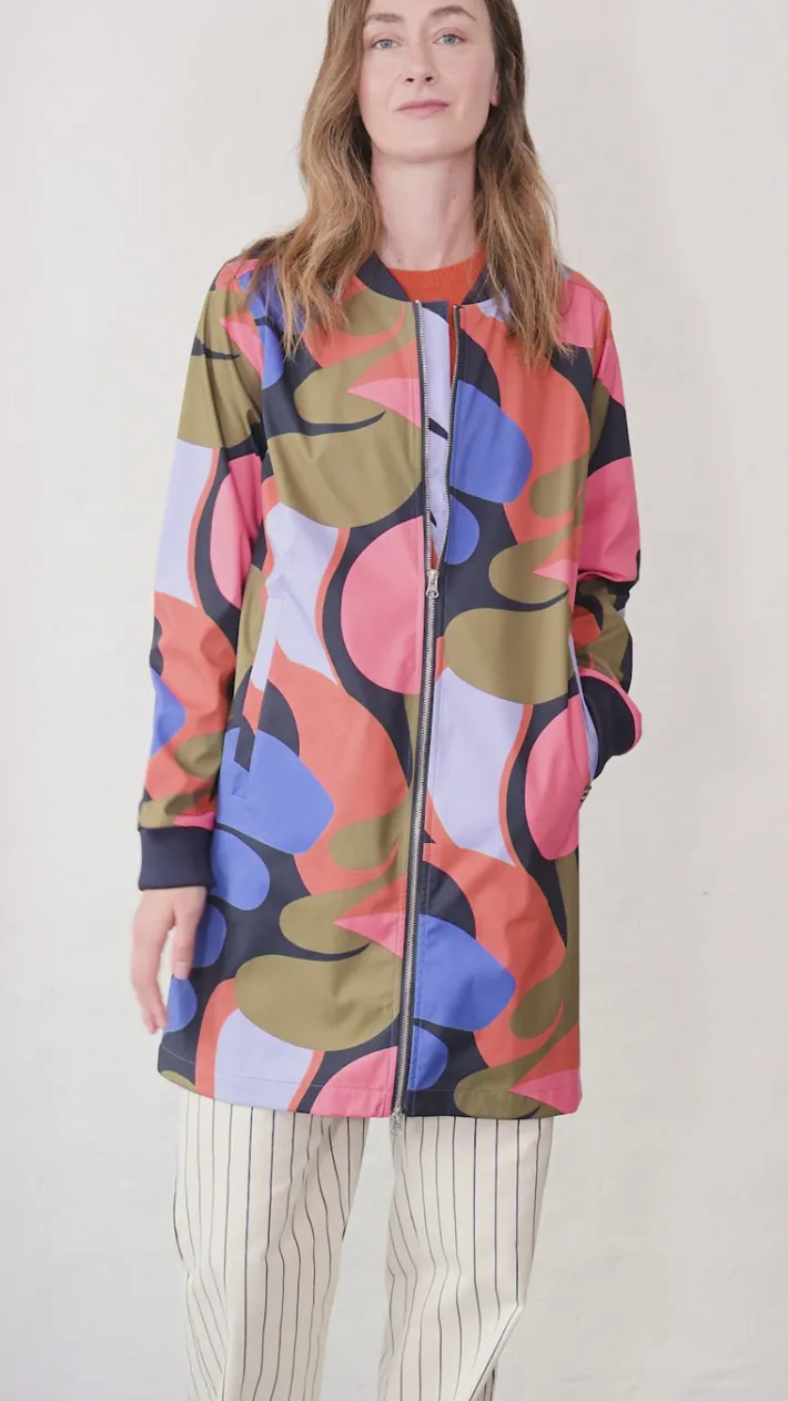 Frakken lukkes med en lynlås, som også kan lynes op nedefra, så man nemt kan cykle i frakken.