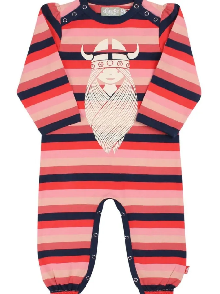 Baronesse Suit er en lækker heldragt i den dejligste, bløde bomuldsblanding. Dragtens fine farver og det store, flotte print på maven, gør den til en sikker favorit i garderoben. Der er trykknapper ved begge skuldre og benene, hvilket gør det nemt at få dragten af og på. Heldragten sidder behageligt med plads til bleen, leg og bevægelse. Der er brede kanter ved både håndled og ankler, der får dragten til at sidde til uden at stramme. Baronesse suit består af 95 % økologisk bomuld og 5 % elastan. Elastanen gør materialet strækbart og dermed endnu dejligere at have på. Børnetøj fra Danefæ er tøj, som børn forstår. De sjove prints og flotte farver taler til børnene. Alt vores tøj er produceret ud fra tre kerneværdier: kvalitet, omtanke og ansvarlighed. Kvalitet betyder, at der skal være plads til leg og bevægelse, samt at farve, form og tryk kan holde vask efter vask efter vask. Omtanke betyder, at vi har meget klare standarder for brugen af kemikalier samt for de sikkerhedskrav vores produkter skal leve op til. Alle vores produkter er fri for fluorstoffer og andre skadelige kemikalier. Ansvarlighed betyder at alle vores ting bliver produceret under forhold, vi kan stå inde for. Vi producerer kun hos BSCI- certificerede producenter, som vi besøger årligt.