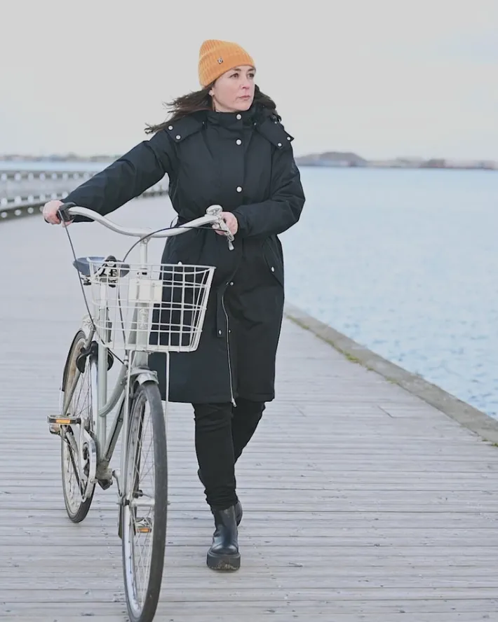 Vinterregnfrakken har et klassisk snit med bindebånd i livet. Regnfrakken er perfekt til cykelturen på arbejde, gåturen med hunden og de mange timer på legepladsen.