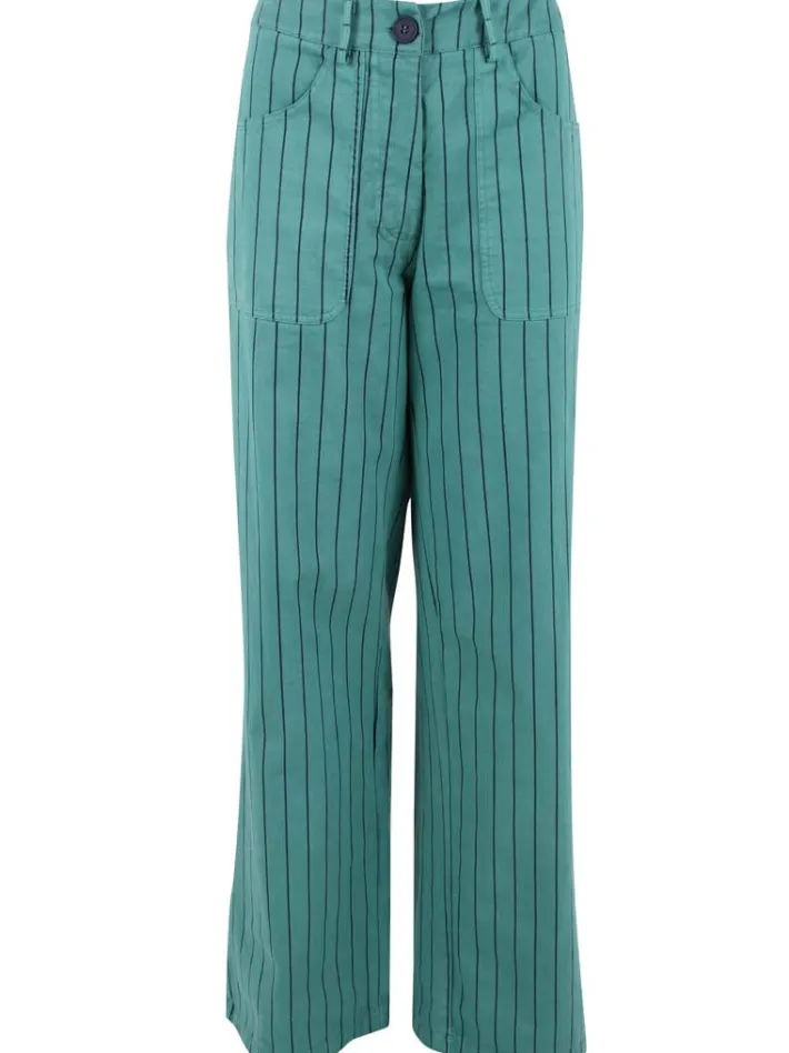 The trousers have a straight fit with large front pockets. They are high-waisted and close with a zipper in the front.