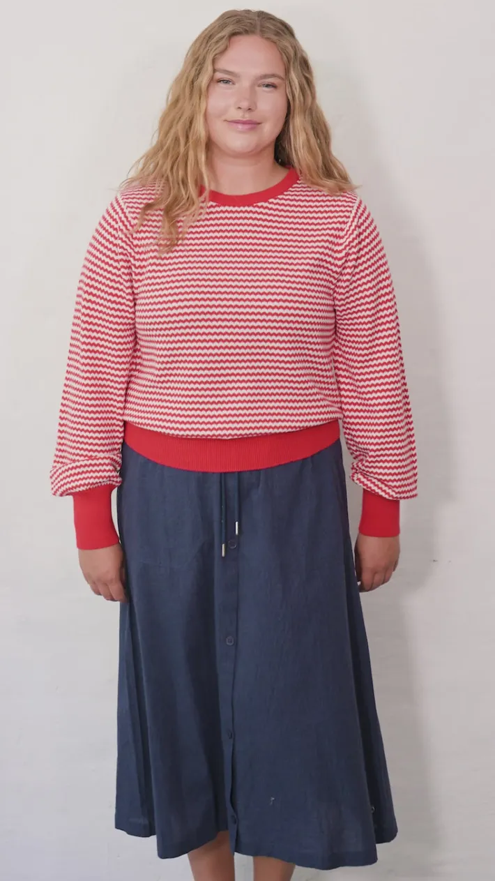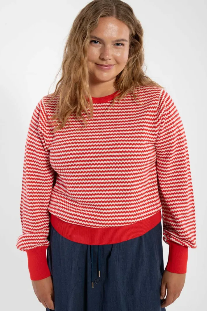 Sweateren er i 100% bomuld og den strikkede kvalitet giver en smule stretch, så den er meget behagelig at have på.