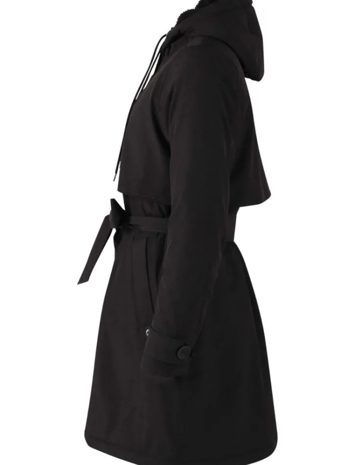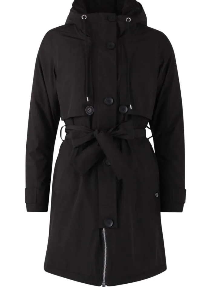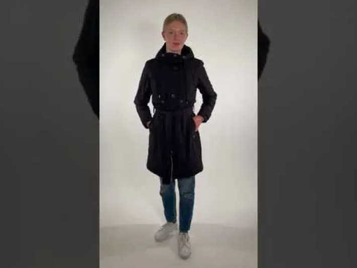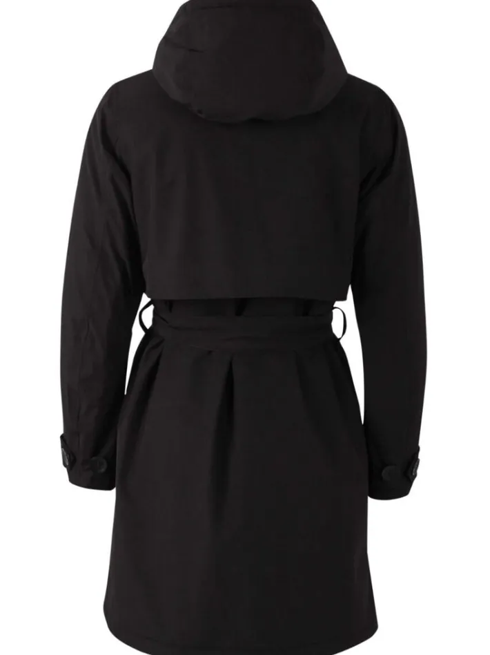 Frakken har to store skrålommer foran. Frakken har et flot bindebånd i livet, så frakken kan bindes ind i taljen. Du kan også binde bindebåndet bag på frakken i den ønskede bredde, så du ikke behøver at binde det hver gang. Frakken kan reguleres ved håndleddene, så vinden holdes ude. Hætten kan justeres, så den sidder helt tæt til hovedet. Frakken er coatet med Bionic Coating og er helt fri for skadelige fluorcarboner.