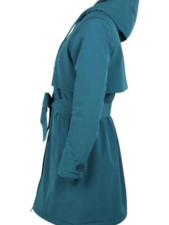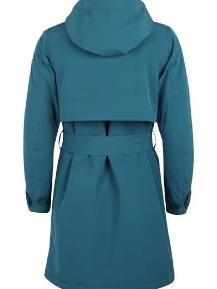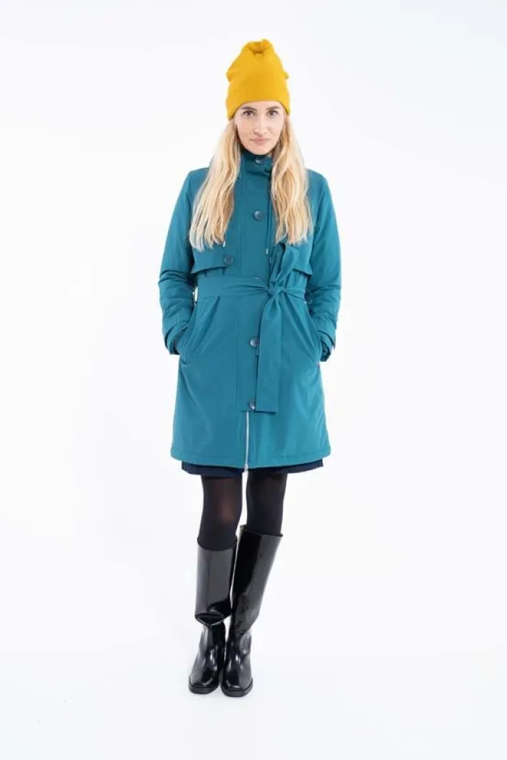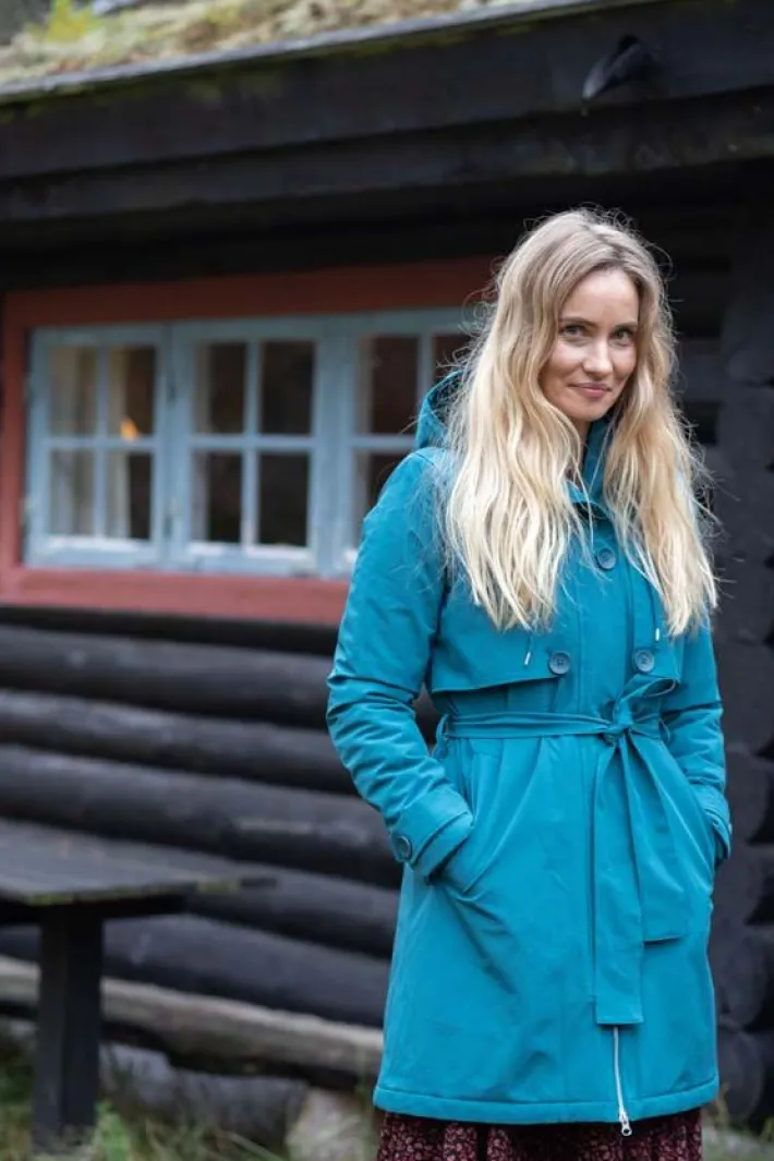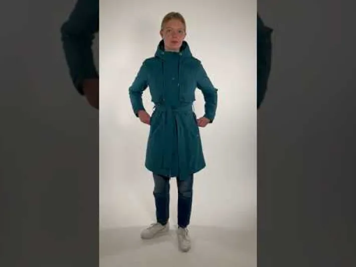 Frakken har to store skrålommer foran. Frakken har et flot bindebånd i livet, så frakken kan bindes ind i taljen. Du kan også binde bindebåndet bag på frakken i den ønskede bredde, så du ikke behøver at binde det hver gang. Frakken kan reguleres ved håndleddene, så vinden holdes ude. Hætten kan justeres, så den sidder helt tæt til hovedet. Frakken er coatet med Bionic Coating og er helt fri for skadelige fluorcarboner.