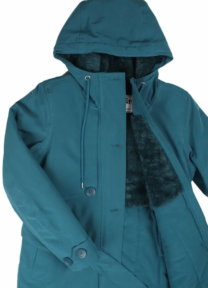 Vinterfrakken kombinerer de tekniske egenskaber fra skitøj med et smukt design. Frakken er vindtæt, vandtæt, åndbar og rigtig varm. Alle frakkens sømme er tapede, så regnen holdes 100% ude. Frakken har et kompakt termofoer, Termolite, som er et særligt teknisk foer, der er meget varmt, men samtidig kompakt, så det ikke fylder meget. Det betyder, at man har stor bevægelighed i frakken, og den sidder super flot. Frakken har en dobbelt lynlås, så lynlåsen kan lynes op nedefra, hvilket gør den praktisk til cykling. Lynlåsen er sølvfarvet.
