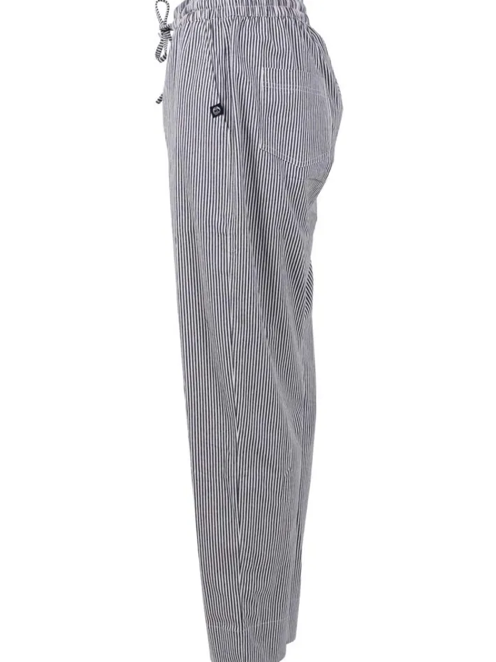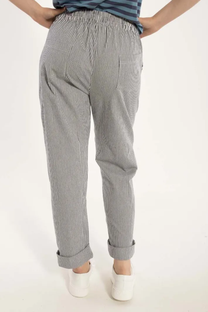 The trousers have two side pockets and pockets at the back, wide legs and an elastic waistband with a drawstring that can be adjusted as needed. They can be worn as they are or rolled up. They are made of cotton with stretch and will therefore be comfortable to wear.