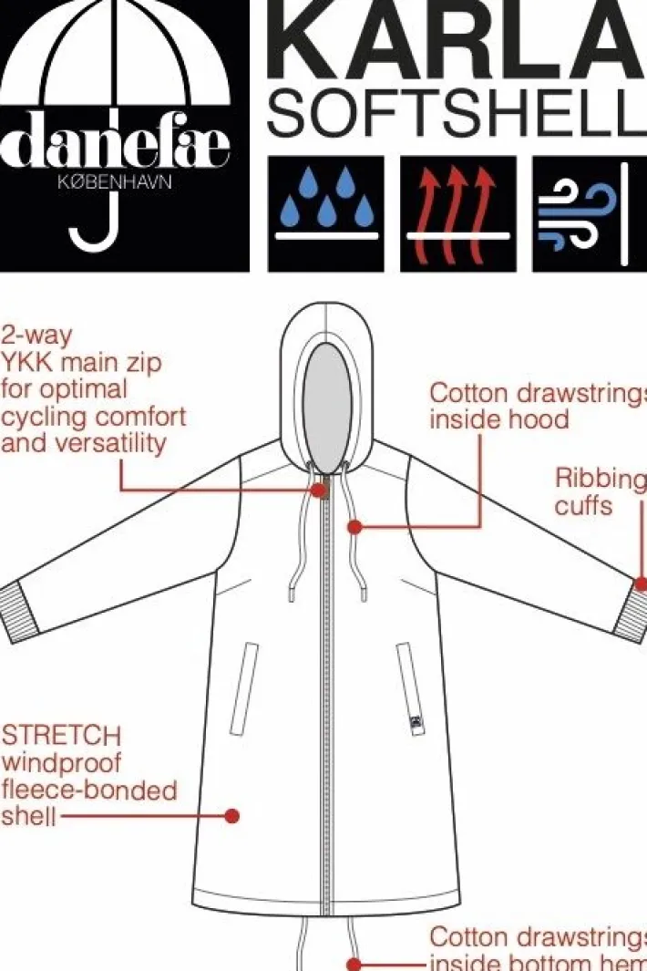 Danekarla softshellfrakke kombinerer alle softshellens tekniske egenskaber med et meget elegant og feminint look. Softshell er et lækkert og meget behageligt strækmateriale, der kombinerer vindtæthed, vandafvisning og varme i en 3-lags konstruktion bestående af: