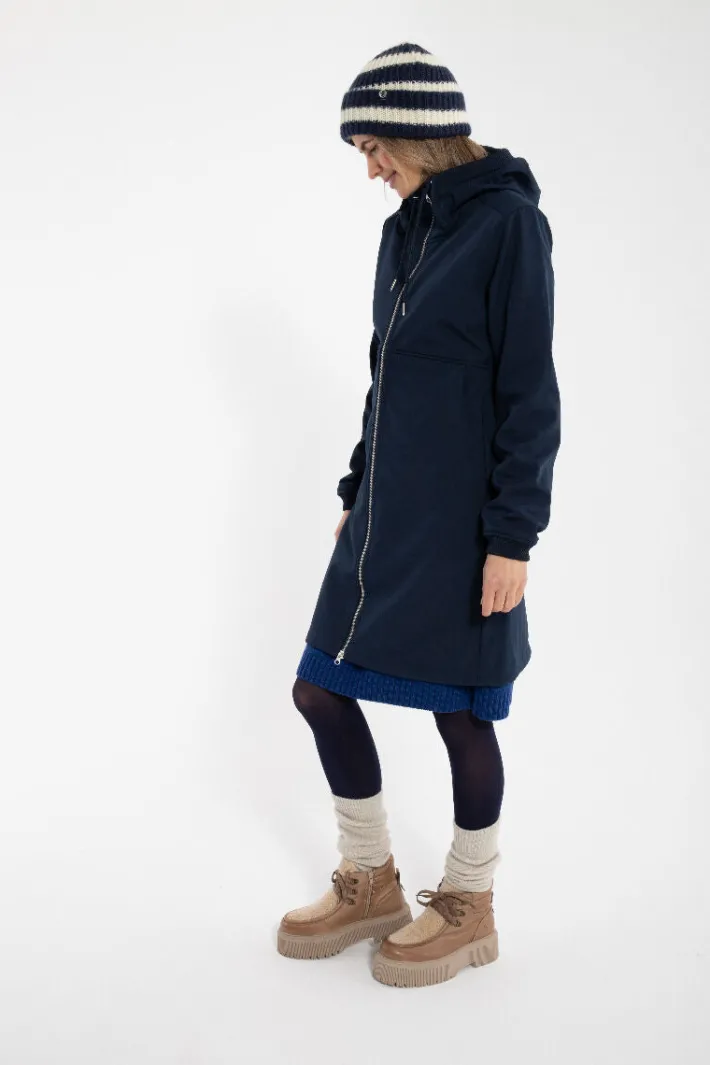 Softshellfrakken sidder elegant og feminint. Frakken har skrålommer. Frakken har ribkant samt snøre ved hætten, således at hætten kan justeres for optimal pasform. Frakken har bred ribkant ved ærmerne, så vind og kulde holdes ude. Frakken har justerbar elastik nederst, således at den kan spændes tættere ind omkring benene, hvis ønsket. Frakken er inderst foret med en blød polarfleece, så den udover at være vindtæt også giver god varme til forår, efterår samt kølige sommeraftener. Frakken lukkes med en lynlås, som også kan lynes op nedefra, så man nemt kan cykle i frakken.