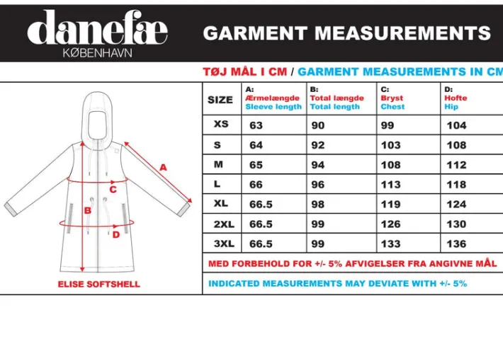 – Beautiful softshell coat with tie at the waist – Beautiful, classic and comfortable design – 8,000 mm waterproof, windproof and breathable – Flour-free coating Elise softshell coat combines all the softshell’s technical properties with a very elegant and feminine look. Softshell is a delicious and very comfortable stretch material that combines windproofness, water repellency and warmth in a 3-layer construction consisting of: outer: high-count polyester stretch outer shell with fluorine-free water-repellent treatment In the middle: wind and water-repellent breathable mid-membrane inside: soft and warm polar fleece on the inside The softshell material has 8,000mm water resistance, which is also windproof and breathable. The coat is coated with a fluorine-free coating and therefore does not contain harmful fluorocarbons. The softshell coat has ties at the waist. The coat has 2 large and spacious front pockets that close with a zip. The coat has a drawstring at the hood so that the hood can be adjusted for optimal fit. The coat has wide elastic at the sleeves, so that wind and cold are kept out. The inside of the coat is lined with a soft polar fleece, so that in addition to being windproof, it also provides good warmth for spring, autumn and cool summer evenings. The coat closes with a zip, which can also be zipped up from below, so you can easily cycle in the coat. Please note that the seams of the coat cannot be taped due to the soft fleece on the inside. This means that rain can get into the seams in heavy rain, so even though the coat can handle a lot of rain, it is not a definite raincoat. The softshell jacket can be machine washed at 30 degrees. In general, it is recommended that you wash outerwear as little as possible. COAT LENGTH: Measured from shoulder down, front of coat. XS 90 cm, S 92 cm, M 94 cm, L 94 cm, XL 98 cm, XXL 99 cm, XXXL 99 cm.