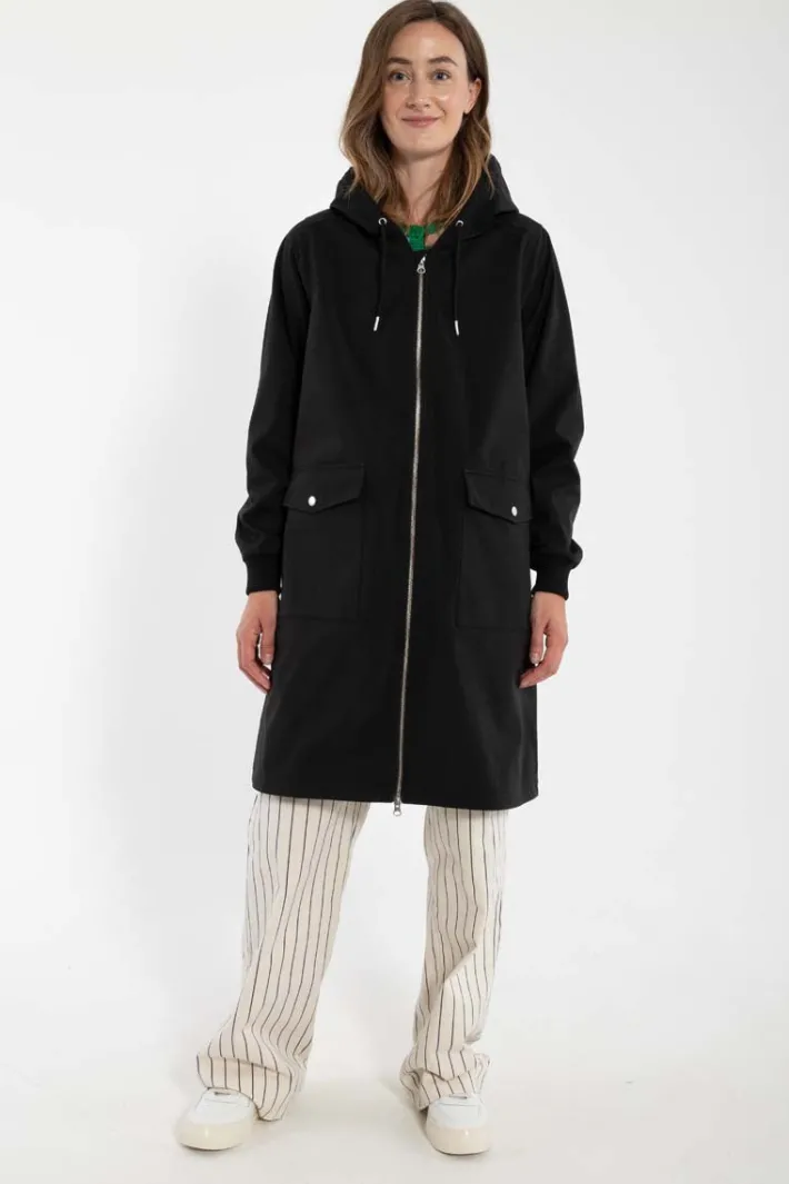 Bemærk at frakkens sømme ikke er tapede. Det betyder, at der kan trække regn ind i sømmene i voldsomt regnvejr, så selvom frakken kan klare en masse regn og materialet er 100% vandtæt, er det ikke en decideret regnfrakke.