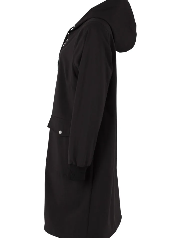 Frakken lukkes med en lynlås, som også kan lynes op nedefra, så man nemt kan cykle i frakken.