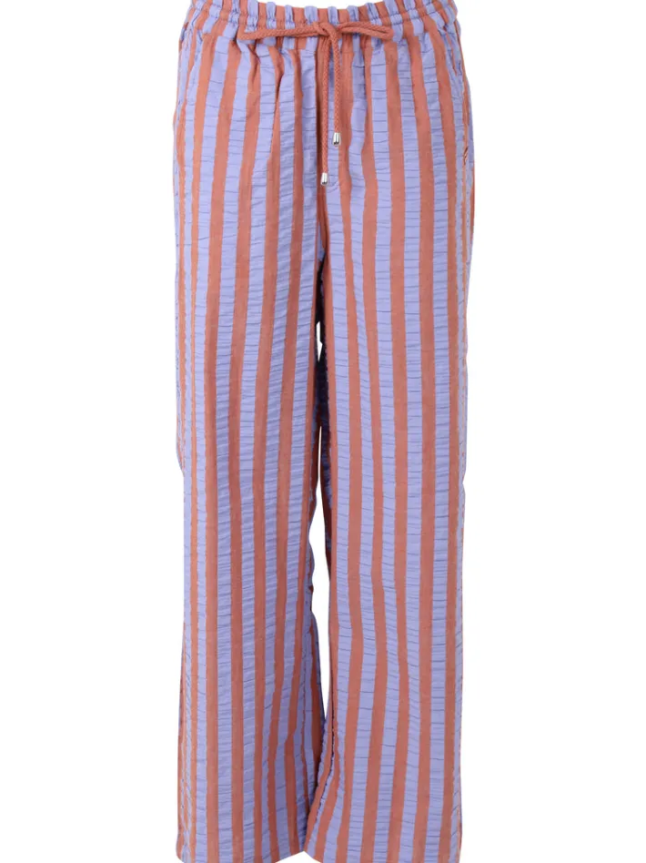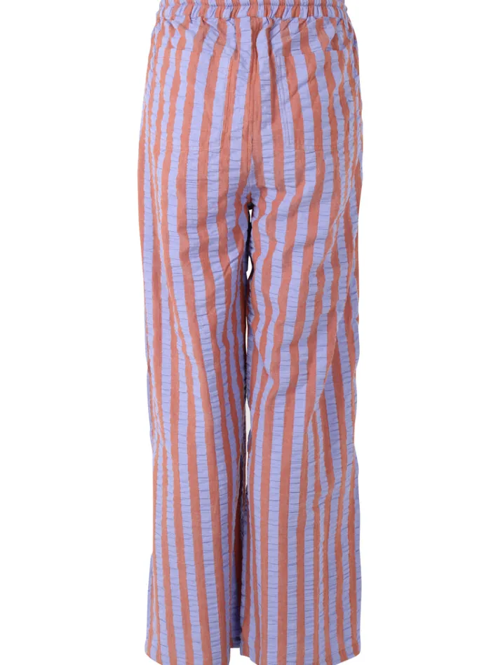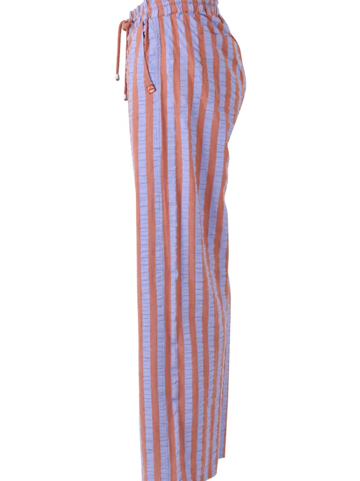 The pants have two side pockets and back pockets, wide legs and an elastic waistband with drawstring that can be adjusted as needed. The pants are made of the most beautiful “stream and wave” material that does not necessarily need to be ironed; perfect for the suitcase too!