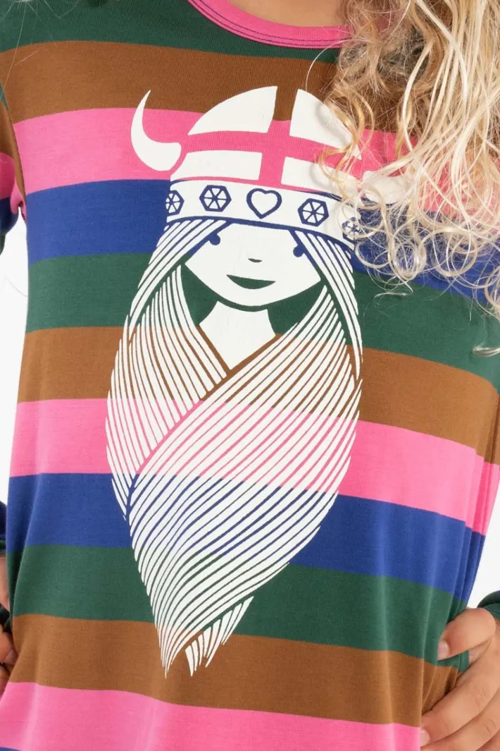Kjolen har lange ærmer og en behagelig pasform med plads til leg og bevægelse. Der er et meget fint flæseskørt, der sammen med de flotte striber og det smukke print gør kjolen til en sikker favorit. Brug den både til hverdag og til fest.