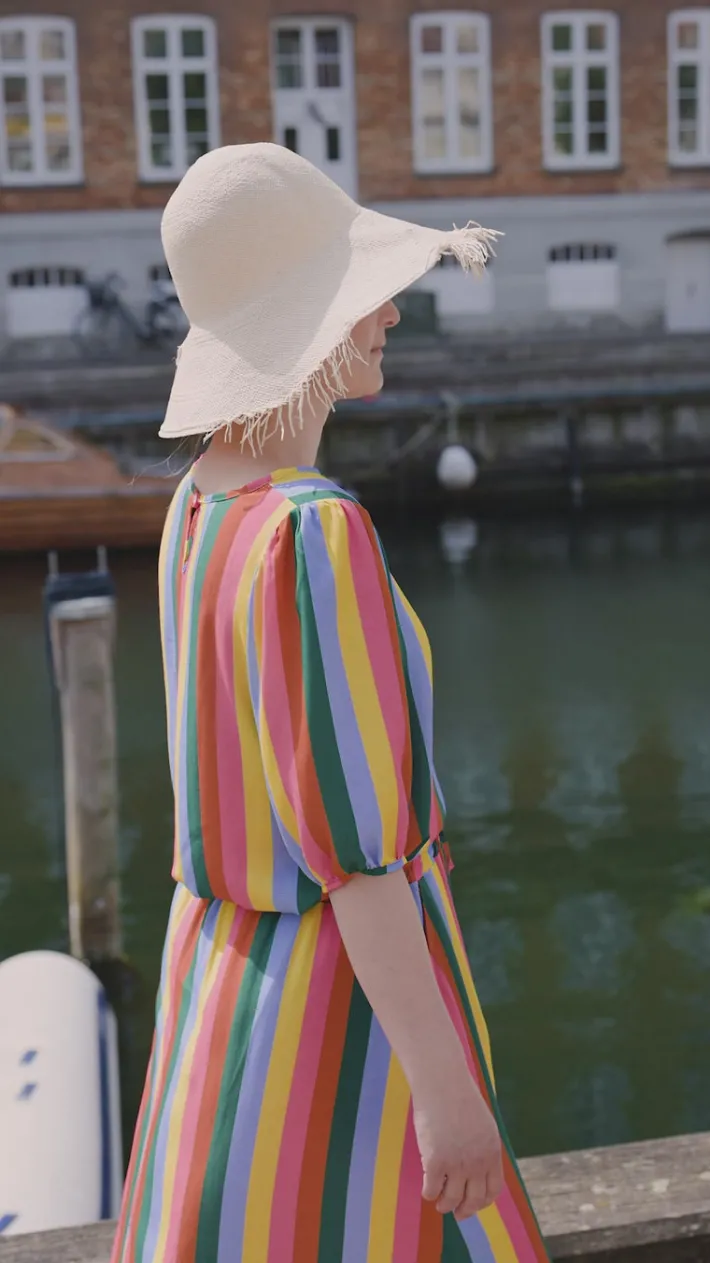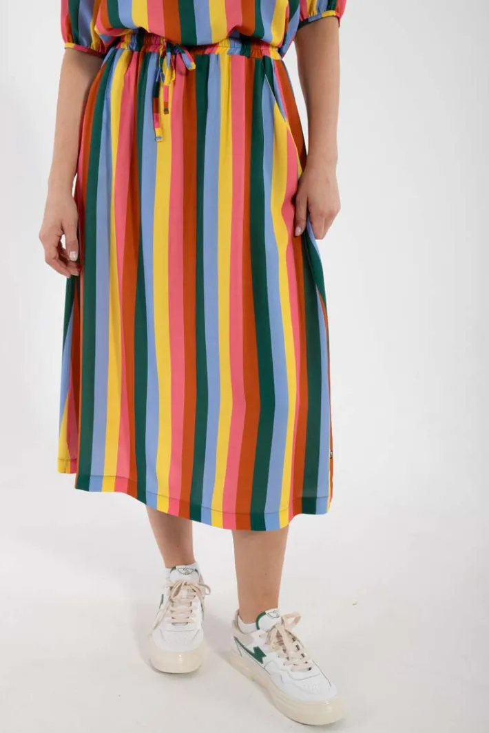 Sweet and feminine skirt with a beautiful and colorful stripe. The skirt has pockets on each side and drawstring on the waistband which can be tightened as needed. The skirt has a good fit and falls beautifully on the body.