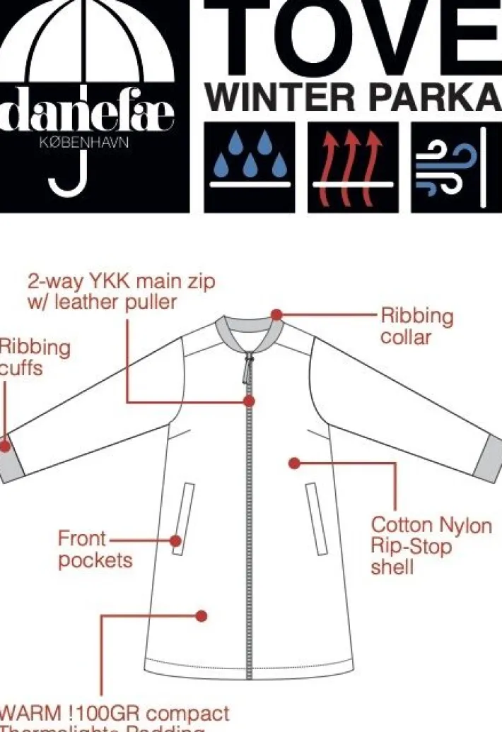 Beautiful women’s winter parka in the good, well-known Danefæ-quality. The parka has a great length, and a double zipper that can be zipped from both ends. That makes this parka perfect for a bike ride! The parka has a ribbed edging by the neck and cuffs that gives a great comfort when it is worn. The pockets are good and wide, and one of them has a small, Danefæ logo. The parka is breathable, as well as wind- and waterproof (5.000). The seams are taped to make sure that no rain enters the parka. The parka is coated with flour free coating.