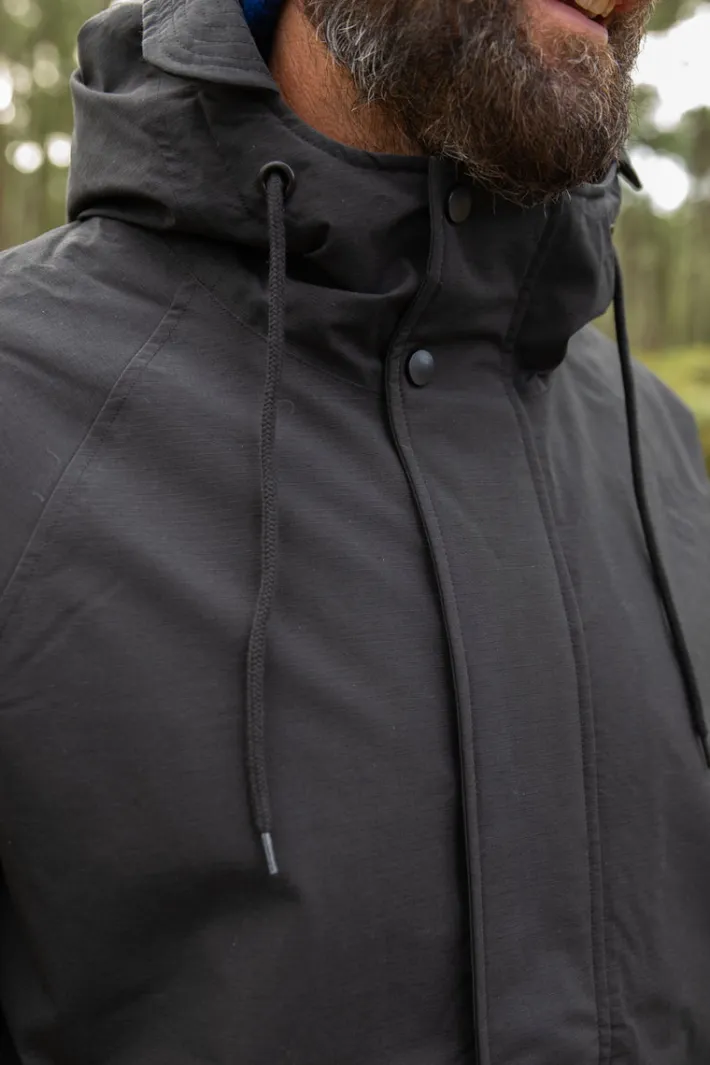 The coat also has two large slanted pockets, so there is room for a phone, wallet and keys. The hood of the coat has cotton cords that can be tightened around the head.