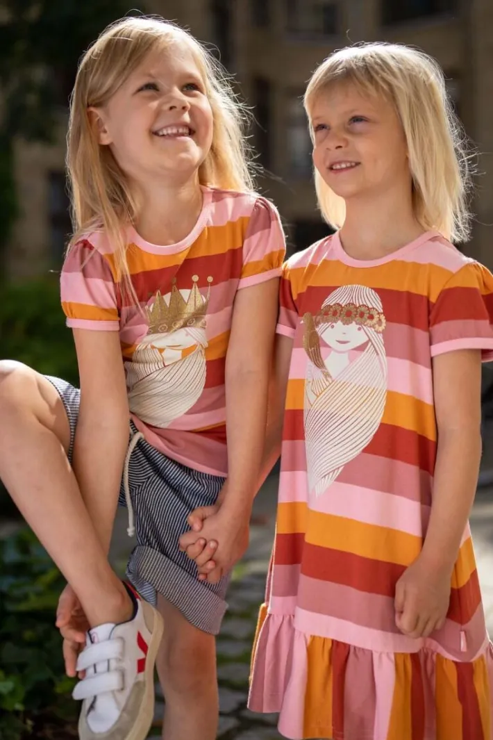 Oeko-tex 100 certifiedBSCI certifiedKeeps shape and color wash after washThe cutest short-sleeved dress in a beautiful fit and a wonderful cotton quality (160 g cotton jersey)Get ready to play with a beautiful and soft dress. The fit is very comfortable and provides plenty of space for play and movement. At the same time, the dress is easy to put on and take off.The dress has short feminine sleeves and ends with a wrinkle stitch at the bottom.Children’s clothing from Danefæ is of high quality and made to be inherited, so the dress can be washed again and again and again and is still beautiful.The dress is Oeko-tex certified according to Oeko-tex standard 100, which is your assurance that the dress does not contain harmful chemicals of any kind. Likewise, our prints live up to the REACH standard of no use of harmful chemicals.All our manufacturers are BSCI certified, which is ours and your assurance that the dress is produced under decent working conditions.At Danefæ, we have developed our own set of rules for quality and durability with requirements for color fastness and wear. We regularly inspect and test the products as well as the production.Our goal is that clothes from Danefæ can last child after child and not just be used and thrown away.The dress can be machine washed at 40 degrees.