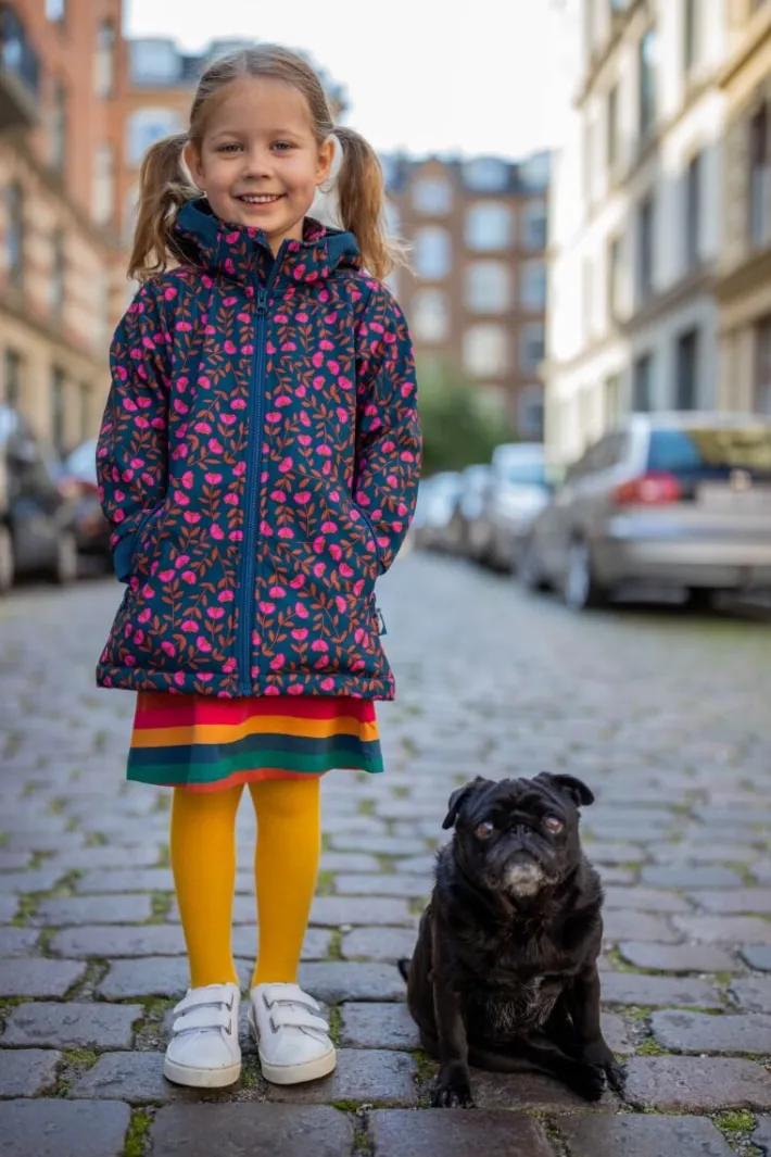 Olivia softshelljakke kombinerer alle softshellens tekniske egenskaber med et sødt look. Softshell er et lækkert og meget behageligt strækmateriale, der kombinerer vindtæthed, vandtæthed og varme i en 3-lags konstruktion bestående af: Yderst: highcount polyester stretch yderskal med fluorfri vandafvisende behandling I midten: vind og vandafvisende åndbar mellem-membran Inderst: blød og varm polar fleece på indersiden Softshellmaterialet har 3.000mm vandtæthed og er samtidig vindtæt og åndbart. Jakken er coatet med en fluorfri coating og indeholder derfor ikke skadelige fluorcarboner. Bemærk at grundet den bløde fleece på indersiden, kan man ikke tape sømmene, så jakken er ikke 100% vandtæt, da der ved tung regn kan trænge vand ind i sømmene. Jakken har aftagelig hætte for barnets sikkerhed. Jakken har bred rib ved håndleddene, så vinden holdes ude. Jakken har to lynlåslommer foran og elastik i ryggen, så jakken får en feminin pasform. Jakken kan spændes ind forneden, så den kan sidde tæt om benene. Jakken er produceret under BSCI-certificerede forhold. Softshelljakken kan vaskes i maskine ved 30 grader. Generelt anbefales det, at man vasker overtøj mindst muligt.