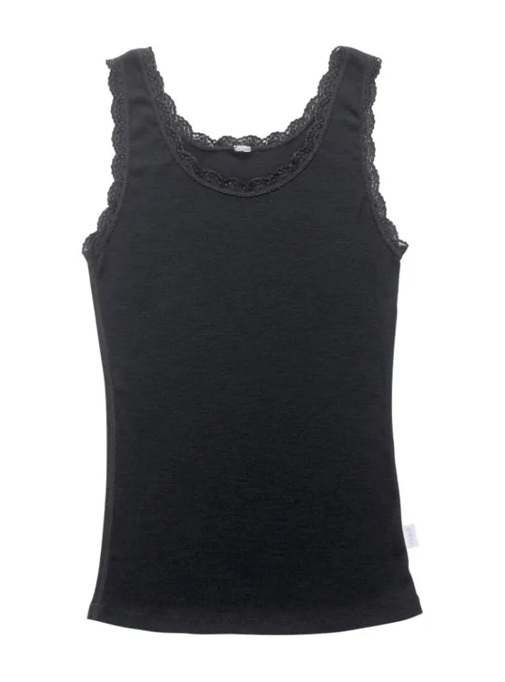 Undertrøje. Sød blondekant i hals og ærmegab. Dejlig blød, elastisk ogribbet uldkvalitet. Kvalitetens strækevne gør at den er behagelig athave på inderst. Brug den gerne som en sød lille top. Ensfarvet. Puremerino wool og Oeko-tex 100 mærket.