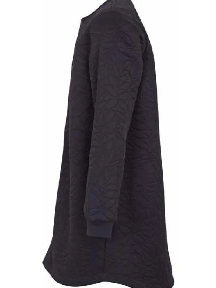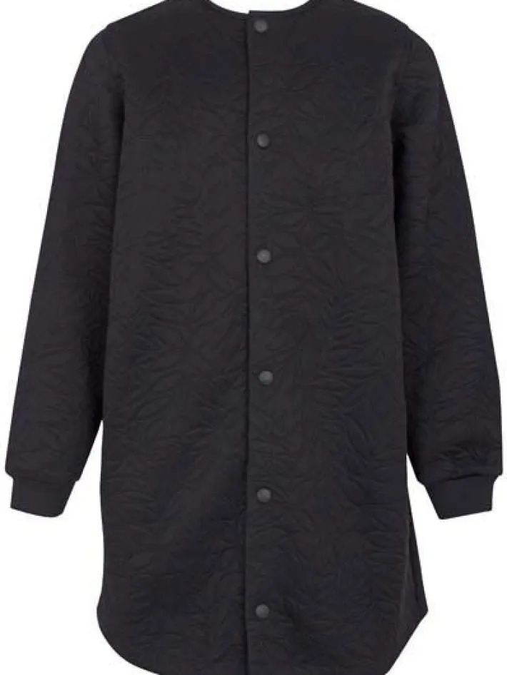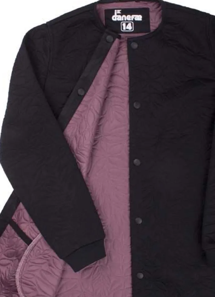 Mini Maude er ‚den nye pige i klassen‘. Superflot og feminin termojakke til piger i sort med cold peonee farve i inderfor. Termojakken er i det fineste blad-quiltede mønster og har trykknapper ned foran. Jakken har et godt rummeligt snit, en lomme i hver side og bagtil runder den rigtigt fint forneden. Ved ærmet er en fin ribkant, som gør den er behagelig at have på.