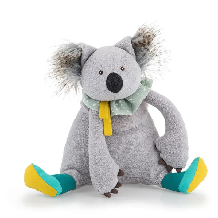 The lazy Koala Gabin is made of soft baby velor and from his ears and belly bristles shaggy fur. He is a wonderful little guy who, despite the lack of an elegant exterior, will be much loved by the little one. Because he is soft, kind and doesn’t expect too much. On his feet he has lime and petroleum colored velor shoes and he wears a smart collar with stars. So here are lots of nice details to discover, even for very small babies. A really soft huggable friend that is suitable from birth.