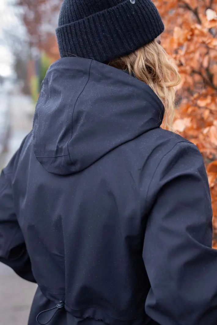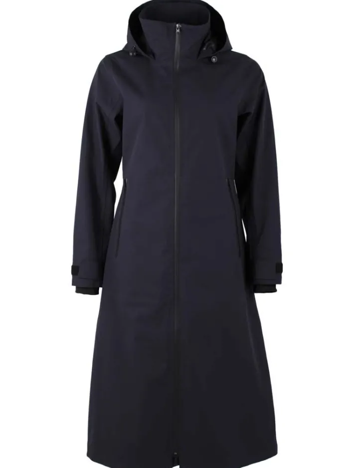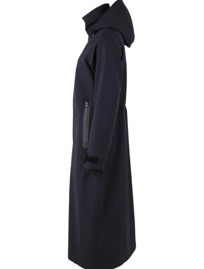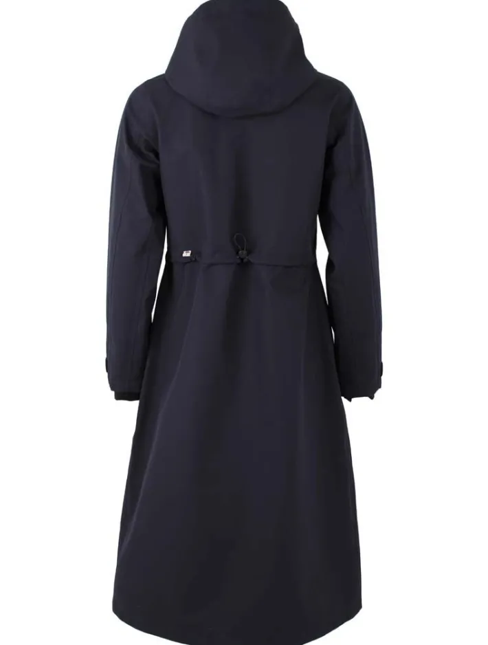 Denne frakke har en tynd elastisk og blød lycra-ribkant ved håndleddet, så vinden holdes ude. Den har en indvendig løbegang i livet, der kan justeres bagpå, således at man kan taljere frakken efter behov. Frakken er figursyet i snittet.