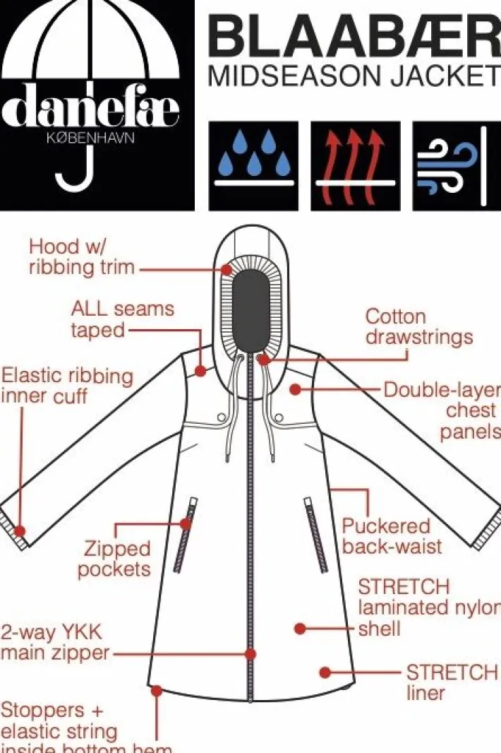 Blaabaer midseasonfrakke er en klassisker i Danefæ-familien. Flot længere model med sølvfarvet lynlås, der kan lynes op nedefra. Store lommer med sølvfarvede lynlåse og fin detalje på bryst/skulder med sølvfarvet trykknap. Ærmerne har vindfang med behagelig elastik rundt om håndleddet. Bagpå er frakken lettere rynket i taljen. Dejlig hætte med rib og snøre for optimal pasform. Midseasonfrakken er lavet i et lækkert strechmateriale, som har et vandsøjletryk på 5.000mm samt tapede sømme, hvilket betyder frakken er helt vandtæt. Åndbar og vindtæt. Flourfri coating (Bionic Finish). En enkelt og klassisk midseasonfrakke.