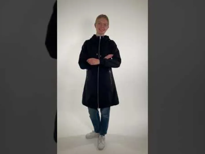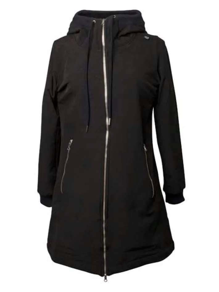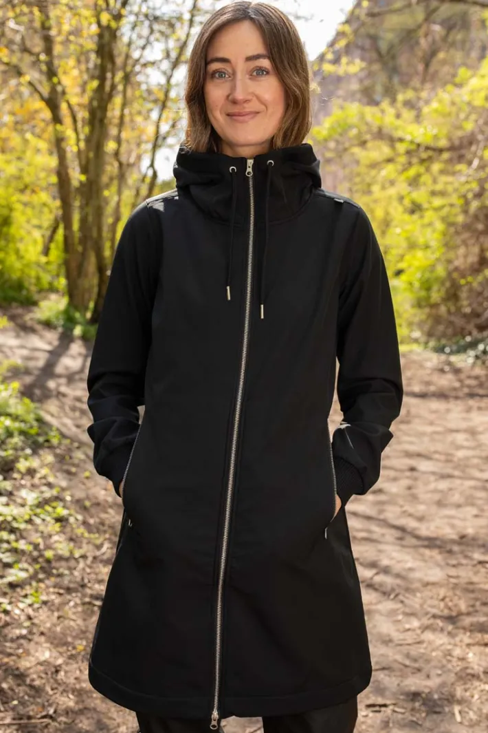 Softshellfrakken sidder elegant og feminint. Frakken har skrålommer, der lukkes med lynlås. Frakken har ribkant samt snøre ved hætten, således at hætten kan justeres for optimal pasform. Frakken har bred ribkant ved ærmerne, så vind og kulde holdes ude. Frakken har justerbar elastik nederst, således at den kan spændes tættere ind omkring benene, hvis ønsket. Frakken er inderst foret med en blød polarfleece, så den udover at være vindtæt også giver god varme til forår, efterår samt kølige sommeraftener. Frakken lukkes med en lynlås, som også kan lynes op nedefra, så man nemt kan cykle i frakken.