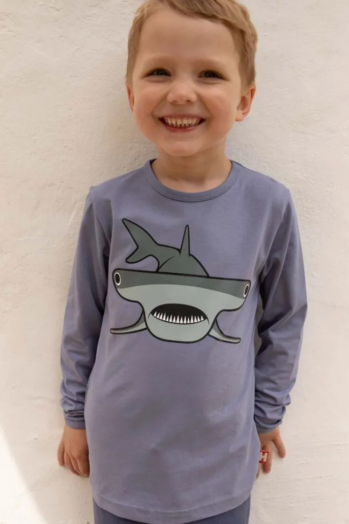 Skøn bluse fra DYR med en flot hammerhaj, som sætter gang i fantasien og giver plads til masser af sjov leg. Lavet i bløde materialer, så blusen er dejlig at have på. Materialet består af 95% bomuld (180 gram) og 5 % elastan.
