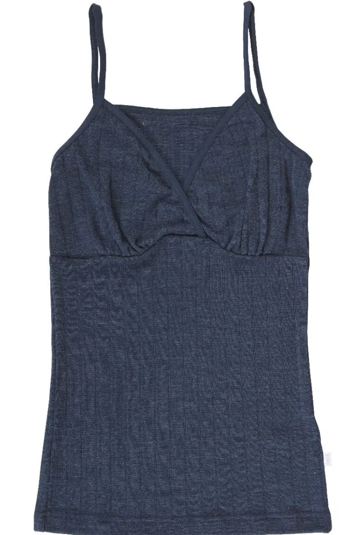 Chimise med tynde stropper. En ekstra blød uldkvalitet med silke som er dejlig behagelig at bruge inderst. Kvaliteten har lodret rille mønster samt et lidt skinnende udryk. Ensfarvet. Wool rich blend og Oeko-tex 100 mærket.