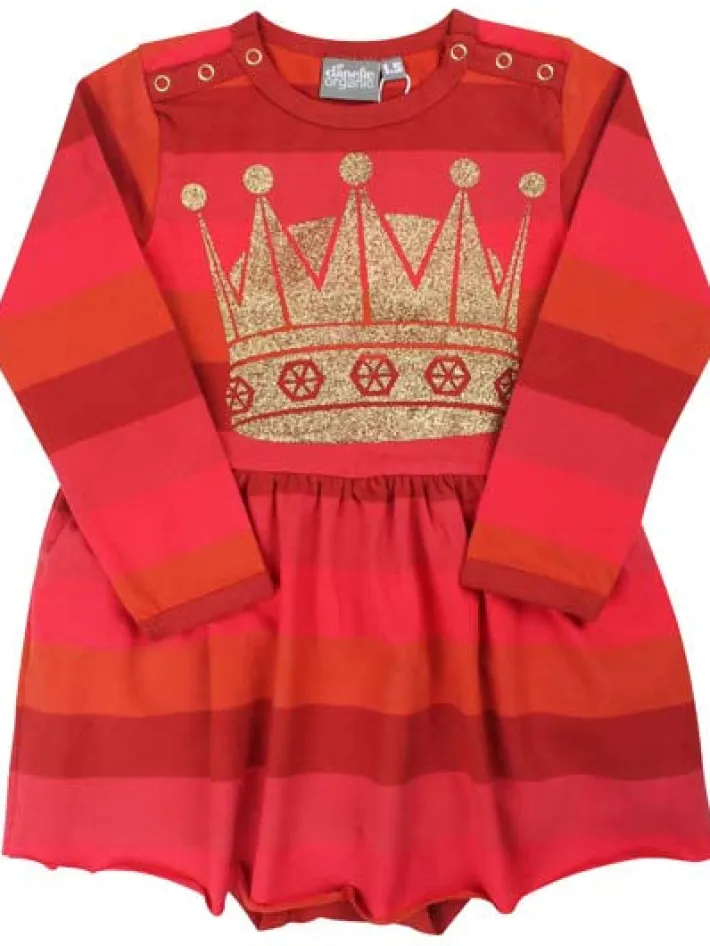 Elsker du økologisk børnetøj, så er Danefæ Organic det rette valg for dig. Danefæ Organic produceres hos vores skønne GOTS certificerede producent og af økologiske materialer. Vores producent har adskillige certificeringer, herunder GOTS, BSCI og Svanemærket, og vi besøger producenten jævnligt for at sikre os, at alt foregår under hensyntagen til miljøet og de personer, der arbejder der. Bæredygtighed handler for os også om at lave kvalitet, der kan bruges igen og igen og barn efter barn, så Danefæs mission er at gøre op med køb og smid væk kulturen, men i stedet arbejde med en kvalitet, som holder barn efter barn og vask efter vask. Så brug dit Danefæ, og send det videre i arv, når du er færdig. Dragten er lavet i den velkendte Danefæ kvalitet, en lækker 210 g børstet bomuld, bestående af 95% bomuld og 5% elastan. Elastanen gør materialet strækbart og derved endnu mere behageligt at have på. Dragten har et lille kjoleskørt påsyet. Ekstra smart til små kjolepiger, hvor den ikke kravler op om livet. Bomulden er børstet, hvilket gør den ekstra blød. Den gode kvalitet holder til vask efter vask uden at miste hverken form eller farve. Dragten er nem at få af og på og rigtig behagelig både at lege og ligge i for den lille.