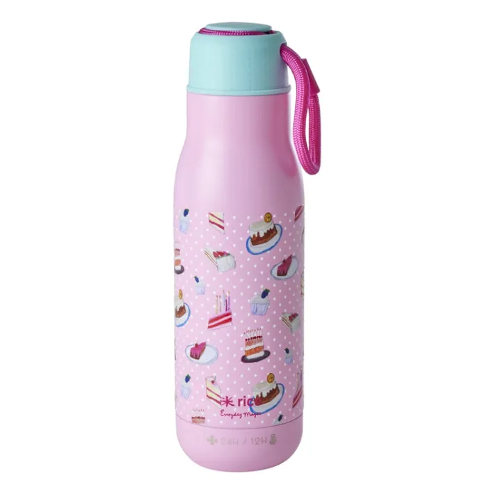 Nyd dine yndlingsdrikke med stil med vores lyserøde drikkedunk med Sweet Cake print. Denne 500 ml flaske er den perfekte makker… den holder dine drikkevarer varme i 12 timer og kolde i 24 timer. Låget, som kan skiftes ud med andre farver, kommer med en praktisk rem, så du nemt kan hænge drikkedunken i din taske, hvis du er på farten.