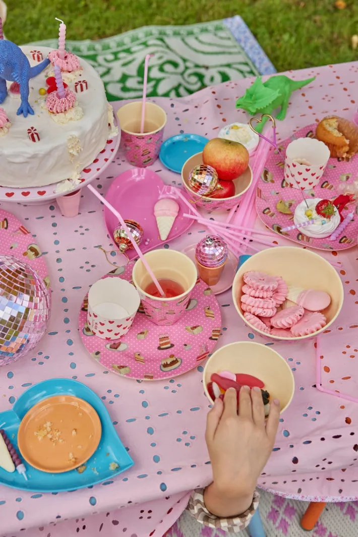 Skøn, rund melamin frokosttallerken med fine, små kager på en lyserød baggrund – vi kalder printet Sweet Cake. Tallerkenen er enkel men farverig, og kan tilføre masser af farve til dit frokostbord, din picnictur eller til en sprød salat – brug den præcis som du vil! Vær opmærksom på, at produktet ikke er egnet til mikroovn.