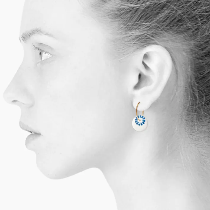Øreringe med vedhæng af hvidt porcelæn, med SCHERNING’s klassiske BLOOM dekoration i flot dyb blå.